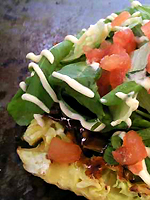 加入烧烤汁,将Step2的色拉和番茄作为配菜。从上面加入蛋黄酱。