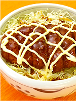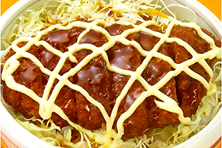 把米饭乘到大腕里,上面放上圆白菜丝,调好味的猪排,最后把沙拉酱浇好即可。